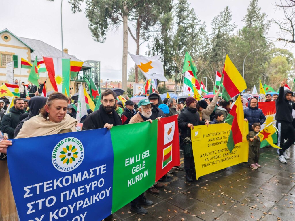 Στους δρόμους και υπό βροχή βρέθηκαν το μεσημέρι Κούρδοι και Κούρδισσες της Κύπρου, καθώς και Κύπριοι αλληλέγγυοι, με αφορμή τις επιθέσεις του τζιχαντιστικού καθεστώτος της Δαμασκού στη βορειοανατολική Συρία. Η πορεία διαμαρτυρίας ξεκίνησε από το Υπουργείο Εσωτερικών, κατευθύνθηκε στο Σπίτι της Ευρώπης στη Λεωφόρο Βύρωνος και κατέληξε στη Βουλή των Αντιπροσώπων.