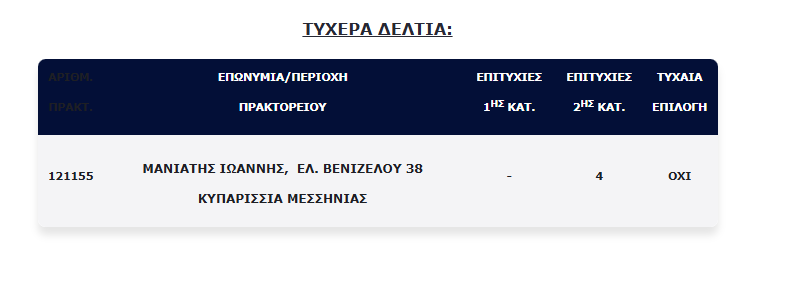 Επίσης, τέσσερα (4) τυχερά δελτία βρέθηκαν στη 2η κατηγορία (5), τα οποία κερδίζουν το ποσό των €100.000,00 για κάθε επιτυχία.