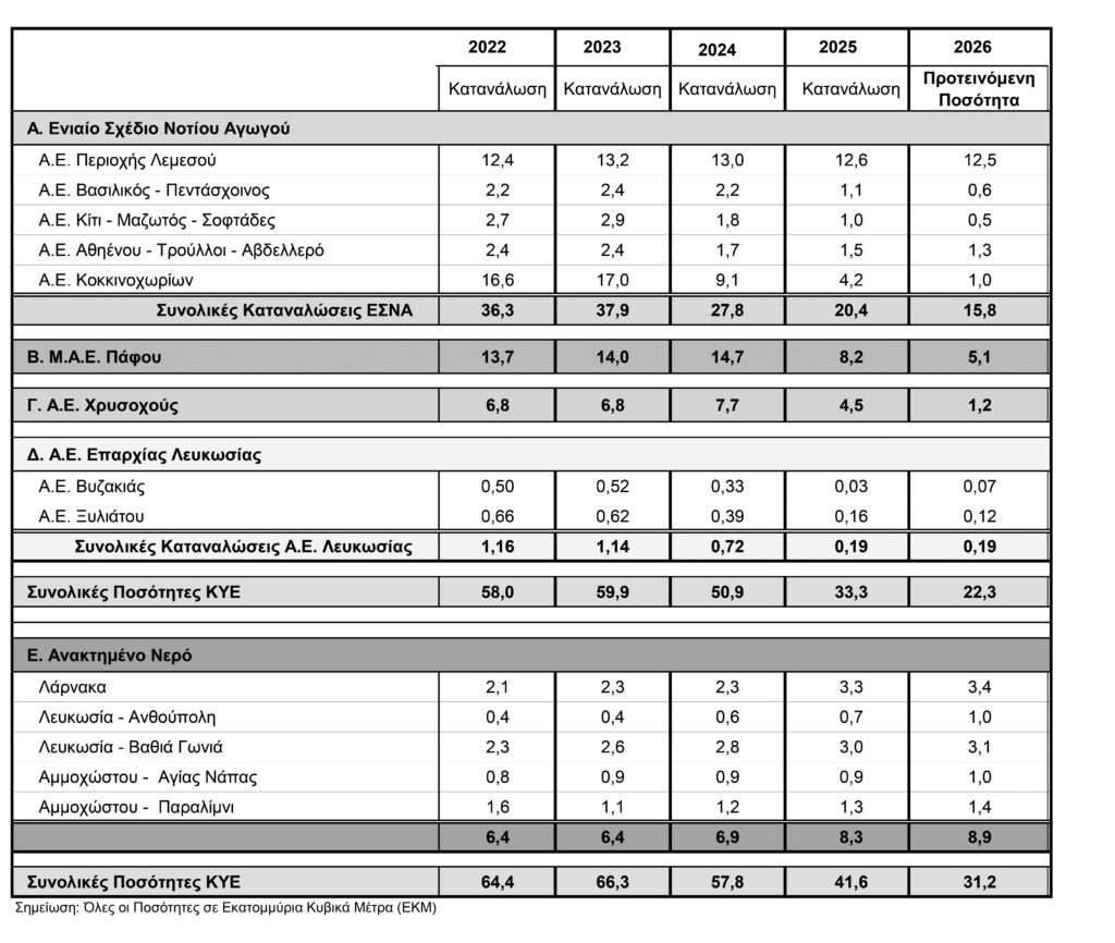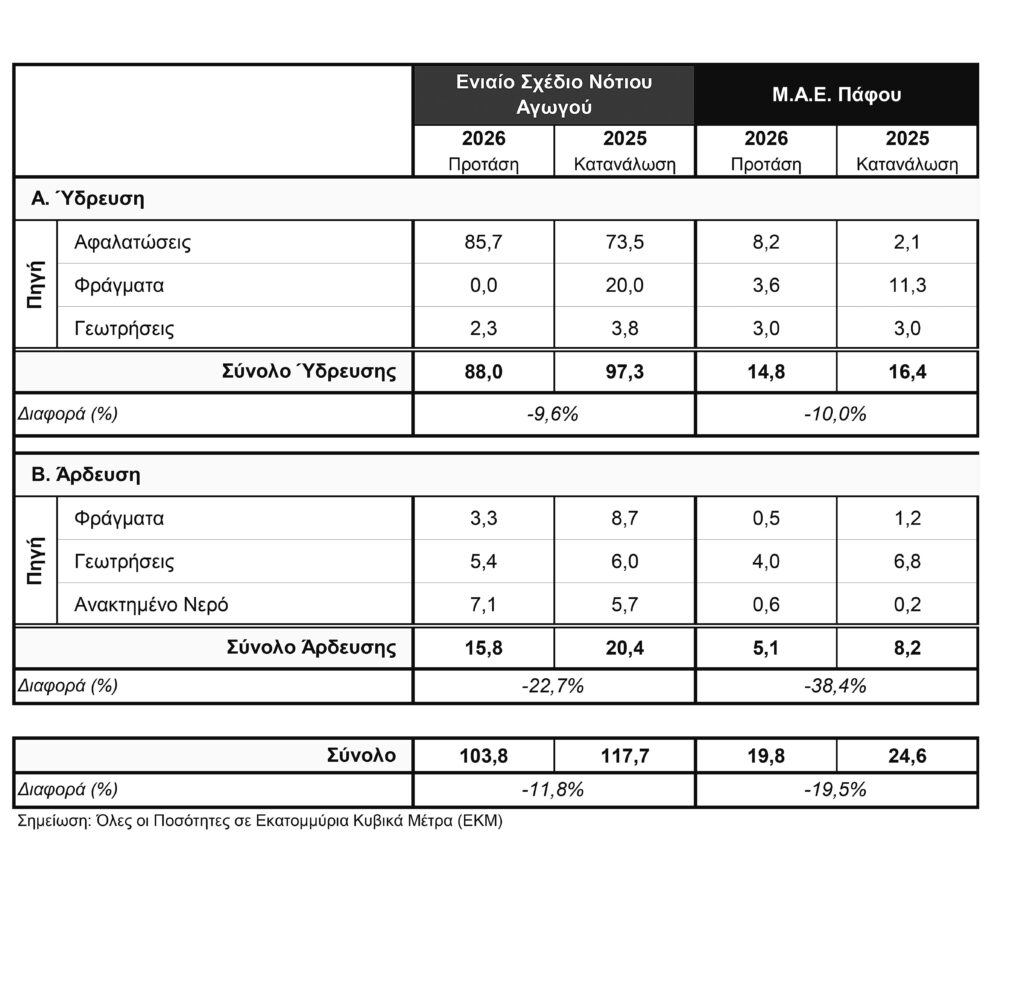 >> Ύδρευση: Θα παραχωρηθούν 103,4 ΕΚΜ (από 114 ΕΚΜ το 2025), μια μείωση 10% που κρίνεται απαραίτητη ως προληπτικό μέτρο για να αποφευχθούν ανεξέλεγκτες διακοπές νερού το καλοκαίρι. Το 2024 παραχωρήθηκαν 110 ΕΚΜ.