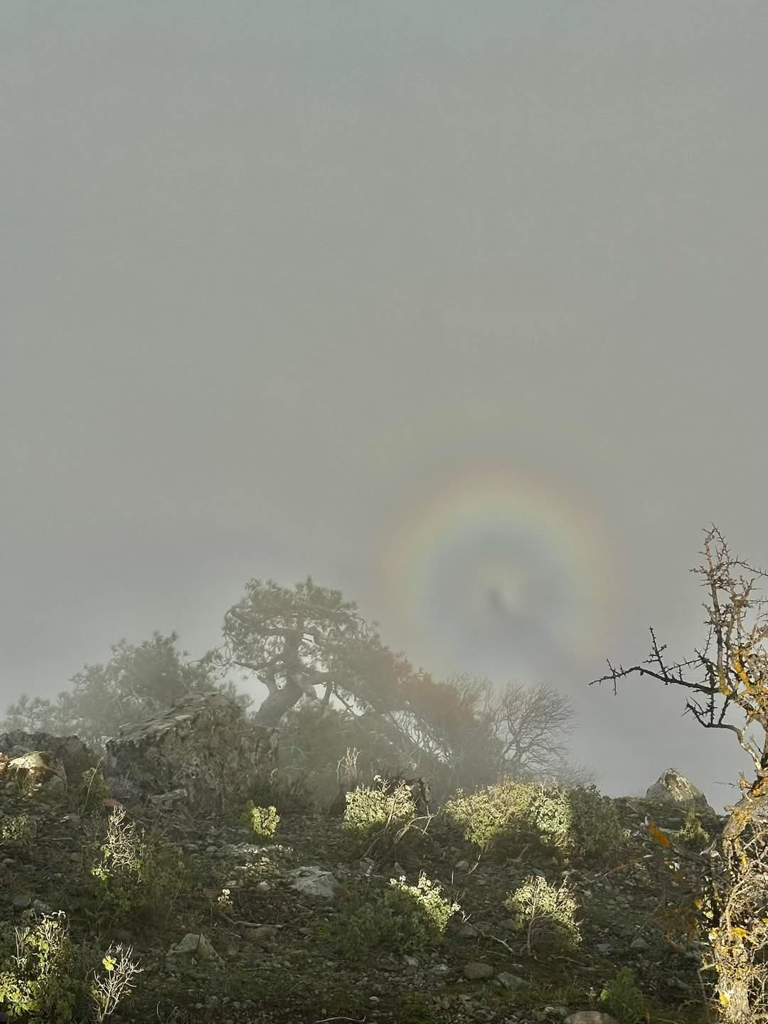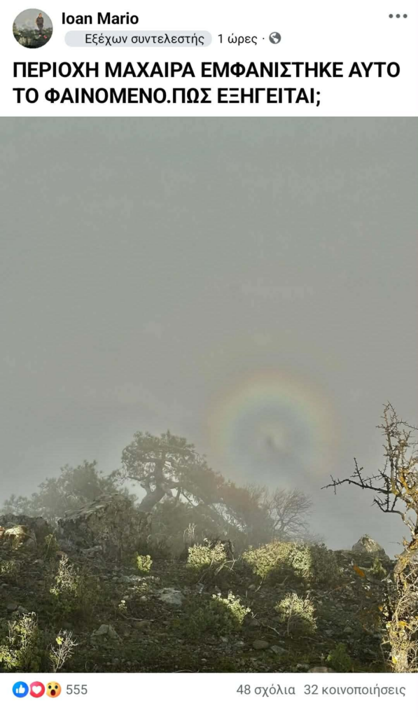 Ένα εντυπωσιακό και σπάνιο οπτικό φαινόμενο καταγράφηκε στην περιοχή Μαχαιρά, προκαλώντας ερωτήματα και έντονο ενδιαφέρον. Η εικόνα, που δείχνει μια μεγεθυσμένη σκιά περιτριγυρισμένη από πολύχρωμο κυκλικό φωτοστέφανο, δεν αποτελεί κάτι μεταφυσικό, αλλά ένα καθαρά μετεωρολογικό φαινόμενο, γνωστό ως «φάντασμα του Μπρόκεν».