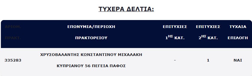 Ένα τυχερό δελτίο βρέθηκε στη 2η κατηγορία, το οποίο κερδίζει το ποσό των €100.000. Όπως δείχνει και η σχετική ανακοίνωση, πρόκειται για δελτίο που παίχτηκε στην Πάφο.