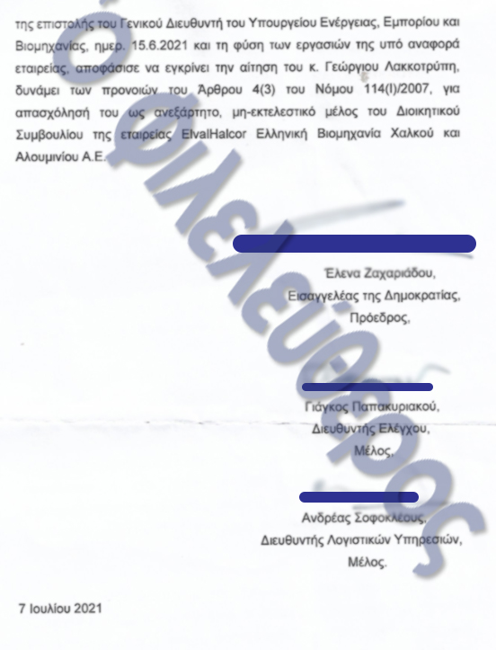 Στην τελευταία σελίδα του ντοκουμέντου που εξασφαλίσαμε και το οποίο συνυπογράφεται από την τότε πρόεδρο της επιτροπής, Έλενα Ζαχαριάδου (εισαγγελέας της Δημοκρατίας), τον Γιάγκο Παπακυριακού (Ελεγκτική Υπηρεσία) και τον Ανδρέα Σοφοκλέους (Γενικό Λογιστήριο) αναφέρονται τα ακόλουθα: «Ενόψει των πιο πάνω, η Επιτροπή, αφού μελέτησε όλα τα δεδομένα της αίτησης που τέθηκαν υπόψη της και λαμβάνοντας ειδικά υπόψη το περιεχόμενο της επιστολής του Γενικού Διευθυντή του Υπουργείου Ενέργειας, Εμπορίου και Βιομηχανίας, ημερ. 15.6.2021 και τη φύση των εργασιών της υπό αναφορά εταιρείας, αποφάσισε να εγκρίνει την αίτηση του κ. Γεώργιου Λακκοτρύπη, δυνάμει των προνοιών του Άρθρου 4(3) του Νόμου 114(Ι)/2007, για απασχόλησή του ως ανεξάρτητο, μη-εκτελεστικό μέλος του Διοικητικού Συμβουλίου της εταιρείας ElvalHalcor Ελληνική Βιομηχανία Χαλκού και Αλουμινίου Α.Ε.».