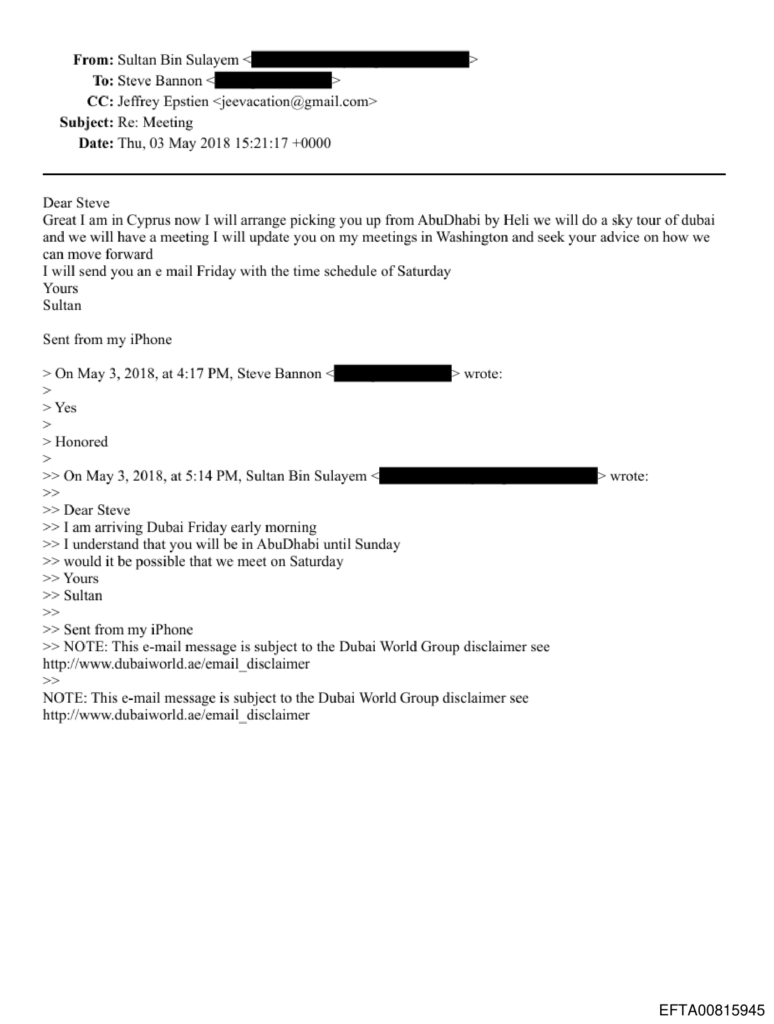 Σε αλληλογραφία του Μαΐου 2018, ο μπιν Σουλαγιέμ ενημερώνει τον Μπάνον ότι «βρίσκομαι αυτή τη στιγμή στην Κύπρο», ενώ παράλληλα, οργανώνεται συνάντηση στα Ηνωμένα Αραβικά Εμιράτα, με μετακίνηση με ελικόπτερο από το Άμπου Ντάμπι και επαφές στο Ντουμπάι. Ο Έπσταϊν εμφανίζεται ως παραλήπτης σε κοινοποίηση των μηνυμάτων.