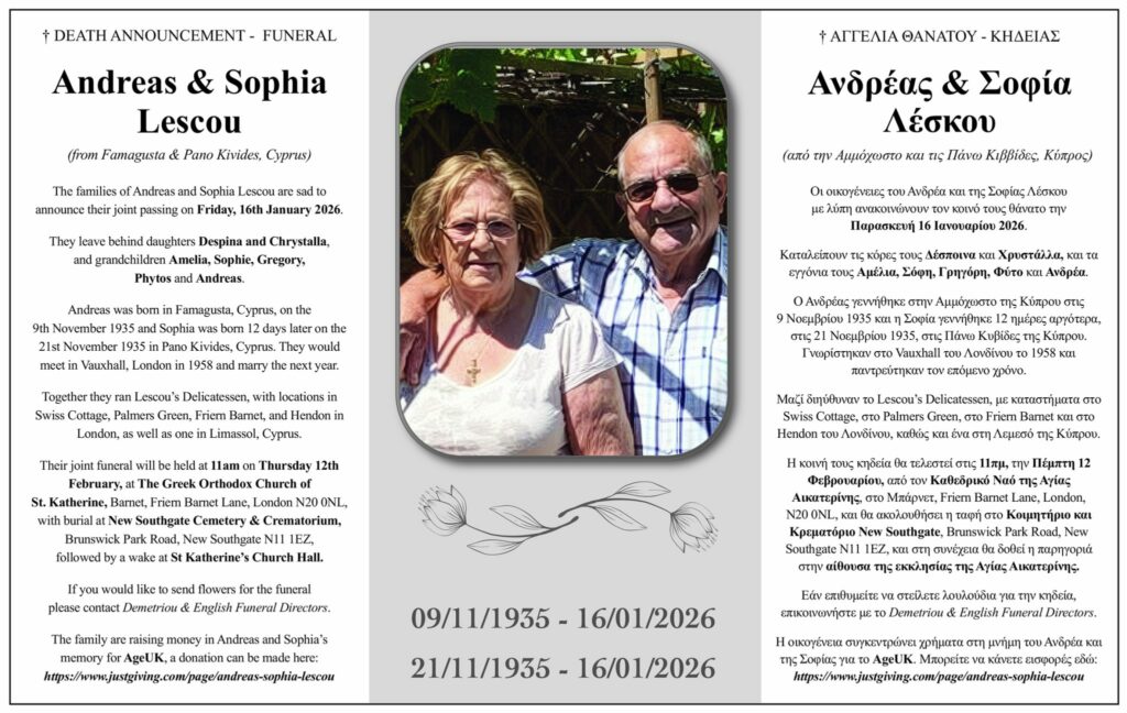 Η κοινή εξόδιος ακολουθία θα τελεστεί στις 11:00 το πρωί της Πέμπτης 12 Φεβρουαρίου, στον Ελληνορθόδοξο Ιερό Ναό Αγίας Αικατερίνης στο Barnet (Friern Barnet Lane, London N20 0NL). Η ταφή θα πραγματοποιηθεί στο Κοιμητήριο και Κρεματόριο New Southgate (Brunswick Park Road, New Southgate N11 1EZ), ενώ θα ακολουθήσει δεξίωση μνήμης στην αίθουσα της εκκλησίας της Αγίας Αικατερίνης.