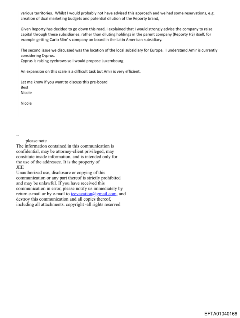 Τα email, με ημερομηνία τον Ιούλιο του 2017, αφορούν συζητήσεις για τη χρηματοδότηση και τη δομή επέκτασης της ισραηλινής εταιρείας τεχνολογίας Reporty, συμπεριλαμβανομένης της επιλογής ευρωπαϊκής δικαιοδοσίας για θυγατρική εταιρεία.