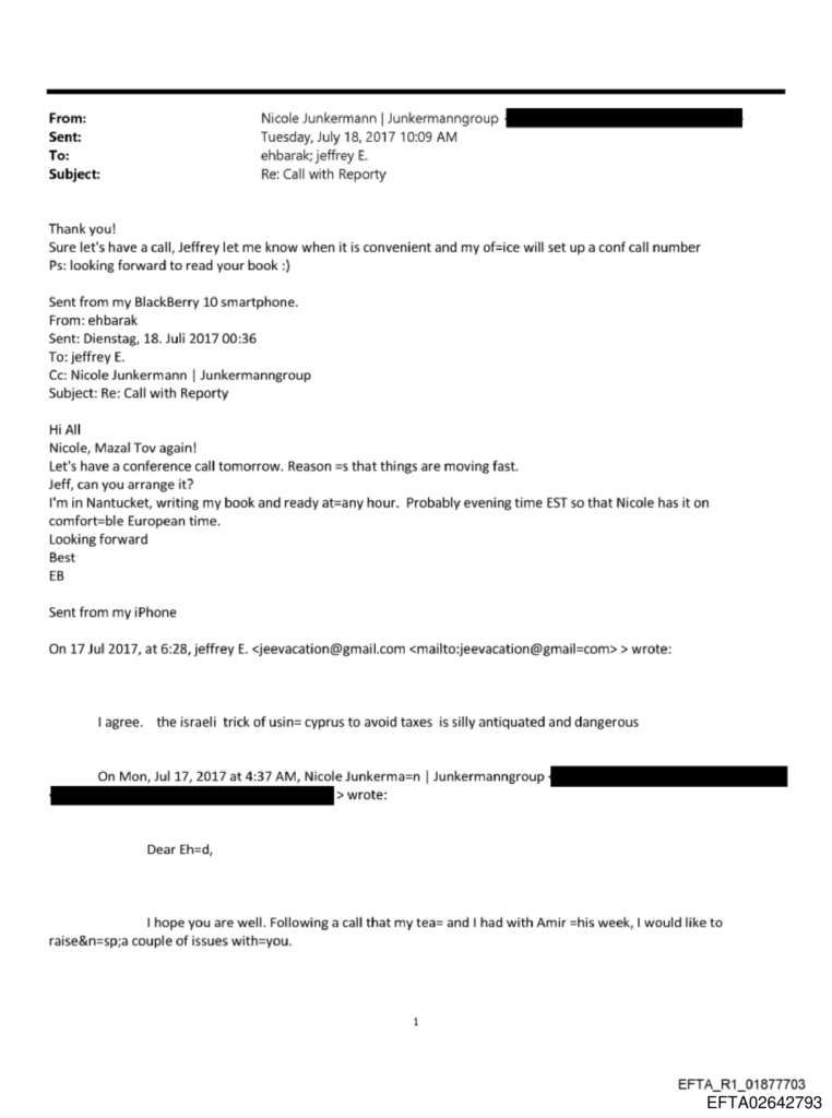 Η Κύπρος εμφανίζεται ως τοποθεσία για ίδρυση εταιρείας που εξετάστηκε αλλά τελικά απορρίφθηκε σε συζητήσεις μεταξύ του Τζέφρι Έπσταϊν και του πρώην πρωθυπουργού του Ισραήλ Εχούντ Μπάρακ, σύμφωνα με ηλεκτρονική αλληλογραφία που περιλαμβάνεται στα αρχεία της υπόθεσης Έπσταϊν.