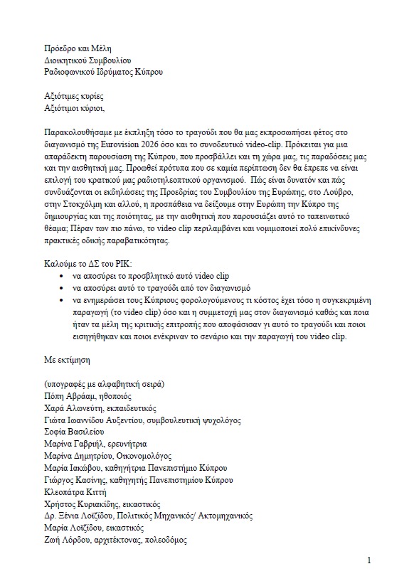 Στην επιστολή, οι υπογράφοντες αναφέρουν ότι παρακολούθησαν με έκπληξη τόσο το τραγούδι όσο και το video clip, κάνοντας λόγο για μια «απαράδεκτη παρουσίαση της Κύπρου», η οποία όπως σημειώνουν–προσβάλλει την ιστορία, τις παραδόσεις και την αισθητική του τόπου. Παράλληλα, τονίζουν πως δεν πρόκειται για ζήτημα καλλιτεχνικής επιλογής, αλλά για θέμα αρχών και δημόσιας ευθύνης.