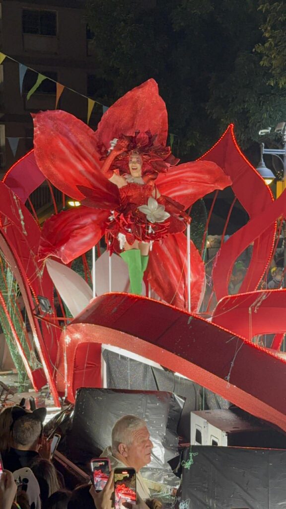 Πάνω σε άρμα και φορώντας μια εντυπωσιακή κόκκινη στολή, η Αμαρυλλίς Κυριάκου βάζει το στέμμα της βασίλισσας κατά τη διάρκεια εκδήλωσης.