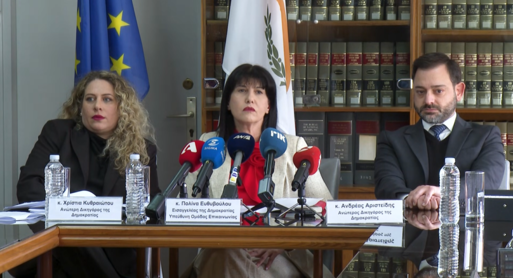 Το μεσημέρι της περασμένης Τετάρτης ενώ όλοι ανέμεναν διάσκεψη Τύπου με τη συμμετοχή του Γενικού Εισαγγελέα, η Νομική Υπηρεσία επέλεξε να βγάλει μπροστά μια ομάδα που απαρτίζεται από την Εισαγγελέα Πωλίνα Ευθυβούλου και δύο ανώτερους δικηγόρους της Δημοκρατίας, τον Ανδρέα Αριστείδη και τη Χρίστια Κυθραιώτου.