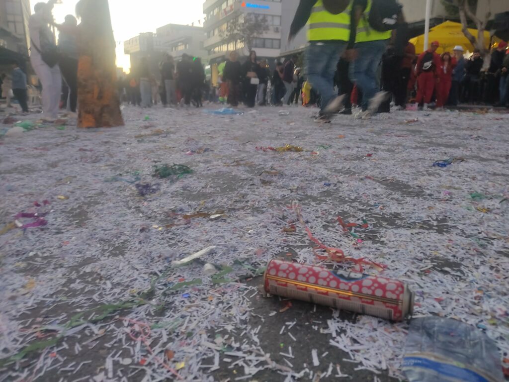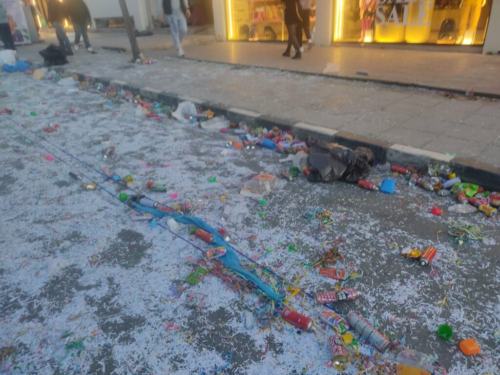 Για ακόμη μία χρονιά, χιλιάδες σπρέι έκαναν την εμφάνισή τους, χωρίς να λείπουν ούτε από τα χέρια μικρών παιδιών ούτε από εκείνα των καρναβαλιστών. Ενδεικτικές είναι οι εικόνες που κατέγραψε το philenews μετά το πέρας της παρέλασης όπου τα απομεινάρια της παρέλασης κάλυψαν στην κυριολεξία ολόκληρο τον δρόμο χωρίς να φαίνεται η άσφαλτος. Σπρέι, χαρτοπόλεμος, κονφετί και σερπαντίνες κυριαρχούσαν στους δρόμους και στα πεζοδρόμια.