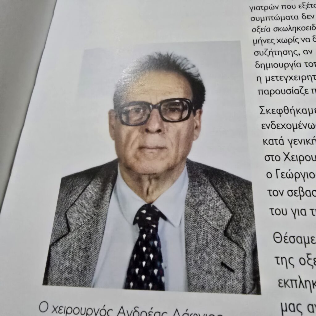Σκεφθήκαμε ότι τη δεκαετία του 1950 η αντιμετώπιση της οξείας σκωληκοειδίτιδας, ενδεχομένως, να ήταν διαφορετική από τη σημερινή. Γι’ αυτό το λόγο προστρέξαμε σε ένα, κατά γενική ομολογία, καταξιωμένο και γνωστό χειρουργό, ο οποίος το 1956 εργαζόταν στο Χειρουργικό Τμήμα του Γενικού Νοσοκομείου Λευκωσίας, του οποίου διευθυντής ήταν ο Γεώργιος Μαραγκός, ο «πατέρας της χειρουργικής» στην Κύπρο. Μιλήσαμε, λοιπόν, με τον σεβαστό μας συνταξιούχο χειρουργό Ανδρέα Δάφνιο που μας τιμά με την εμπιστοσύνη του για τη δική του υγεία στο Καρδιολογικό Διαγνωστικό Κέντρο στη Λευκωσία.