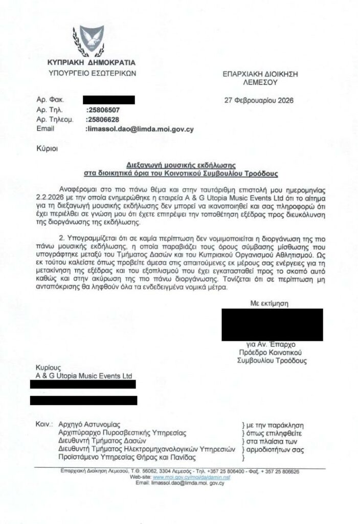 Σε αυστηρή επιστολή της προς τους διοργανωτές (Α. & G Utopia Music Events Ltd) ημερομηνίας 27 Φεβρουαρίου 2026, η Επαρχιακή Διοίκηση Λεμεσού, εκ μέρους του Αν. Επάρχου, υπογραμμίζει ότι η εκδήλωση παραβιάζει τους όρους σύμβασης μίσθωσης μεταξύ του Τμήματος Δασών και του Κυπριακού Οργανισμού Αθλητισμού.