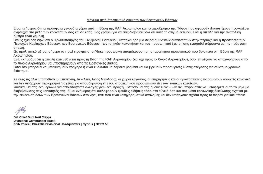 Σύμφωνα με τις ίδιες αναφορές Βρετανοί στρατιωτικοί που υπηρετούν στη βάση και σε άλλες εγκαταστάσεις στην Κύπρο, καθώς και τα μέλη των οικογενειών τους, έλαβαν το βράδυ της ίδιας ημέρας, λίγο πριν τα μεσάνυχτα, ειδοποίηση μέσω ηλεκτρονικού ταχυδρομείου και γραπτού μηνύματος, στην οποία αναφερόταν: