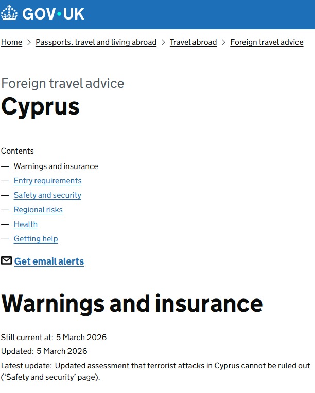 H Βρετανία προειδοποιεί ότι υπάρχει πολύ σοβαρή απειλή για τρομοκρατική επίθεση σε συμφέροντα του Ηνωμένου Βασιλείου σε όλο τον κόσμο και όπου βρίσκονται Βρετανοί υπήκοοι. Για αυτό και έχει αλλάξει ακόμη και τις ταξιδιωτικές της συμβουλές στην σελίδα του Βρετανικού Υπουργείου Εξωτερικών για την Κύπρο και συνιστά σε όσους ταξιδεύουν στην Κύπρο, μεταξύ άλλων κρατών, να είναι εξαιρετικά προσεκτικοί.