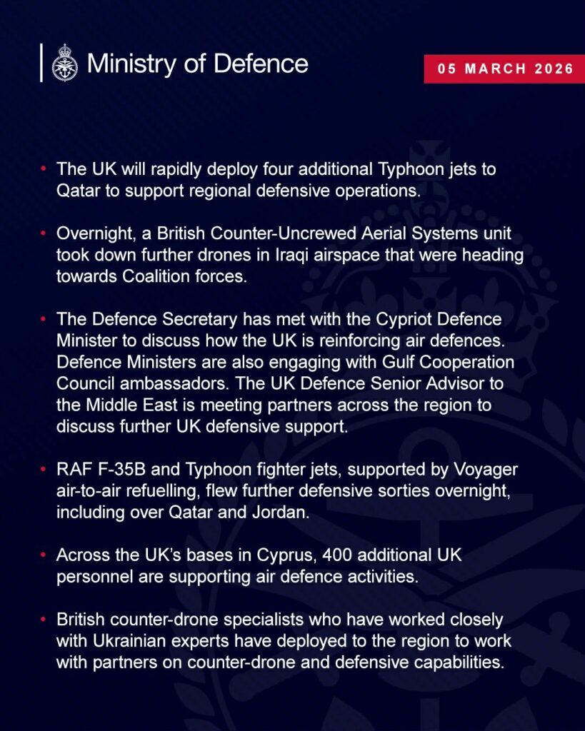 Το Ηνωμένο Βασίλειο θα αναπτύξει άμεσα τέσσερα επιπλέον μαχητικά αεροσκάφη Typhoon στο Κατάρ για την υποστήριξη αμυντικών επιχειρήσεων στην περιοχή. Κατά τη διάρκεια της νύχτας, βρετανική μονάδα Counter-Uncrewed Aerial Systems κατέρριψε επιπλέον drones στον εναέριο χώρο του Ιράκ που κατευθύνονταν προς δυνάμεις του συνασπισμού.