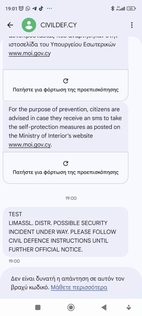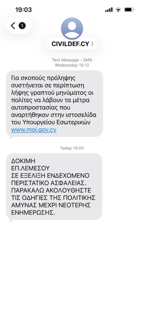 19:03 – Άρχισε η αποστολή των δοκιμαστικών μηνυμάτων στην επαρχία Λεμεσού