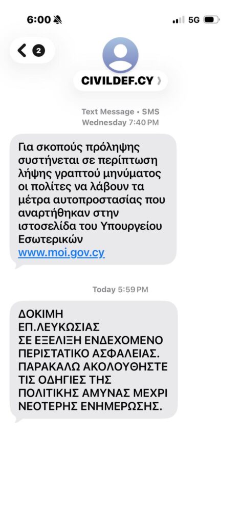 18:04 – Άρχισε η αποστολή των δοκιμαστικών μηνυμάτων στην επαρχία Λευκωσίας