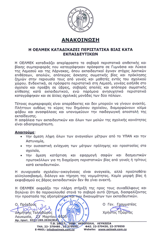 Απερίφραστα καταδικάζει η ΟΕΛΜΕΚ τα σοβαρά περιστατικά επιθετικής και βίαιης συμπεριφοράς που καταγράφηκαν πρόσφατα σε Γυμνάσια και Λύκεια της Λεμεσού και της Λάρνακας εναντίον εκπαιδευτικών.