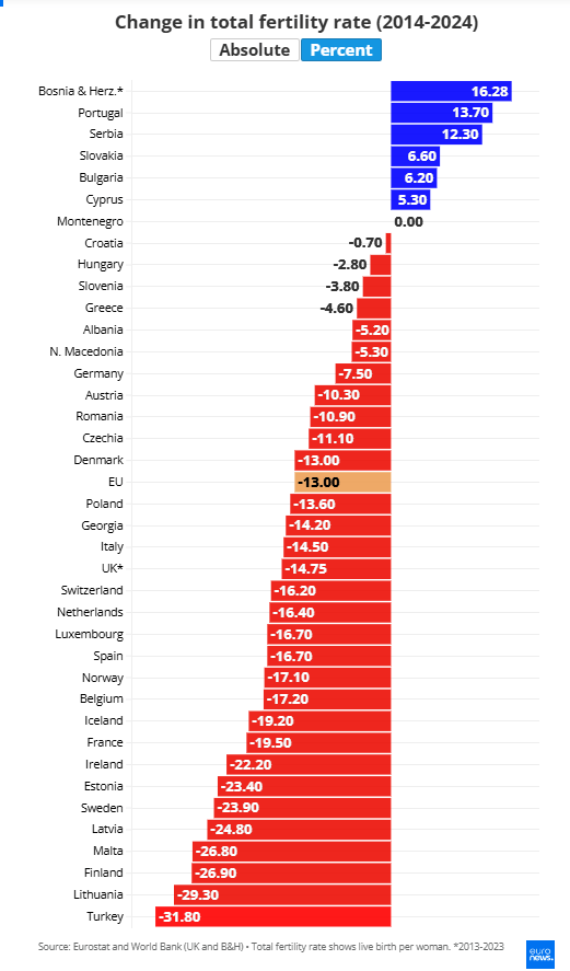 Εξετάζοντας πώς μεταβλήθηκαν οι δείκτες γονιμότητας την τελευταία δεκαετία, από το 2014 έως το 2024, μόνο λίγες χώρες κατέγραψαν αυξήσεις, ενώ πολλές παρουσίασαν σημαντικές μειώσεις. Στην ΕΕ, ο δείκτης μειώθηκε από 1,54 σε 1,34, μια μείωση 0,20 σε απόλυτους αριθμούς.