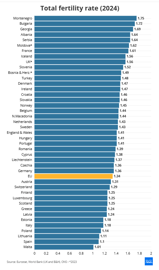 Το Ηνωμένο Βασίλειο (1,56) βρίσκεται κοντά σε αυτό το επίπεδο, αν και τα πιο πρόσφατα διαθέσιμα στοιχεία είναι από το 2023 και ενδέχεται να είναι χαμηλότερα για το 2024. Στην Αγγλία και την Ουαλία, το ποσοστό είναι χαμηλότερο, στο 1,41, σύμφωνα με την ONS.