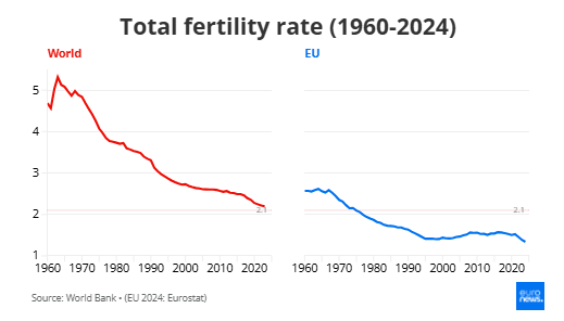 Ο συνολικός δείκτης γονιμότητας στην Ευρωπαϊκή Ένωση, που αποτυπώνει τον αριθμό γεννήσεων ανά γυναίκα, έπεσε στο χαμηλότερο επίπεδό του σε διάστημα άνω των έξι δεκαετιών. Το ποσοστό έχει σχεδόν μειωθεί κατά το ήμισυ τα τελευταία 60 χρόνια, πέφτοντας από 2,62 το 1964 σε 1,34 το 2024.