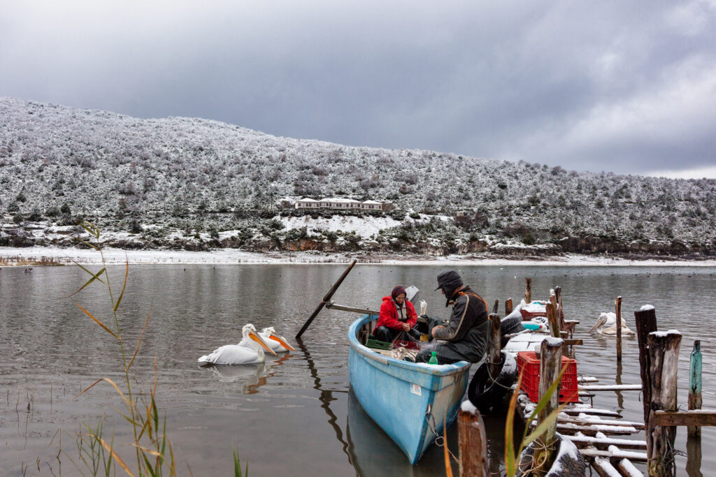 Βάση του οδοιπορικού μας υπήρξε η Καστοριά η οποία δικαίως ονομάζεται και Αρχόντισσα της Δυτικής Μακεδονίας. Χτισμένη στη χερσόνησο της λίμνης Ορεστιάδας, σε υψόμετρο 700 μέτρων, η πόλη αναπτύχθηκε σε άμεση σχέση με το νερό και τα γύρω βουνά του Βιτσίου και του Γράμμου. Η λίμνη αποτελεί σταθερό σημείο αναφοράς της καθημερινότητάς της. Ο περίπατος κατά μήκος της όχθης αποκαλύπτει αυτή τη σχέση. Υδρόβια πουλιά κινούνται στο νερό, ψαράδες ρίχνουν δίκτυα, κωπηλάτες τραβούν κουπί, ενώ οι βυζαντινές εκκλησίες της χερσονήσου θυμίζουν ότι η ιστορία παραμένει παρούσα στον αστικό ιστό. Στην παραλίμνια οδοιπορία μας επισκεφθήκαμε το Σπήλαιο του Δράκου, που προσφέρει μια εντυπωσιακή κάθοδο σε υπόγειες αίθουσες με σταλακτίτες, σταλαγμίτες και λίμνες, φωτισμένες ώστε να αναδεικνύεται η φυσική αρχιτεκτονική της πέτρας. Σύμφωνα με τον θρύλο, δράκος φύλαγε εδώ χρυσάφι —ίσως μια αλληγορία για τον πλούτο της περιοχής.