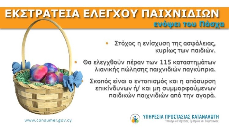 Ενόψει των εορτών του Πάσχα και με στόχο την ενίσχυση της ασφάλειας των καταναλωτών, ιδιαίτερα των παιδιών, η Υπηρεσία Προστασίας Καταναλωτή προχωρεί σε παγκύπρια εκστρατεία ελέγχου παιδικών παιχνιδιών.