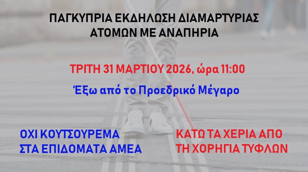 Διαμαρτυρόμαστε για τον από μέρους της κυβέρνησης τερματισμό των πολιτικών αυτών, που θα οδηγήσουν αναπόφευκτά τους τυφλούς και τα άλλα άτομα με αναπηρία στον αποκλεισμό, την εξαθλίωση και μόνιμη προσβολή της ανθρώπινης τους αξιοπρέπειας.