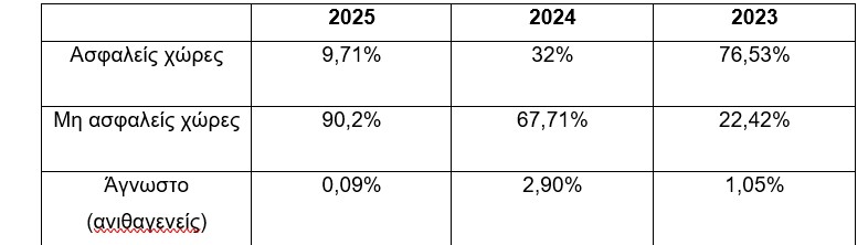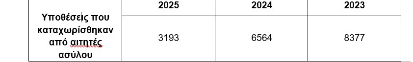 Αυξήθηκαν κατά 68% μέσα σε δύο έτη οι αιτητές ασύλου από μη ασφαλείς χώρες, ωστόσο οι υποθέσεις που καταχωρίσθηκαν μειώθηκαν κατά 59% σε σύγκριση με το 2023. Συγκεκριμένα, το 2025 ήταν 3.193, το 2024 ήταν 6.564 και το 2023 ήταν 8.377.