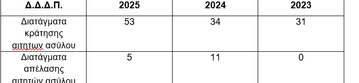 - Σε σχέση με τα διατάγματα κράτησης και απέλασης, το 2025 καταχωρίσθηκαν 53 διατάγματα κράτησης και 5 απέλασης.