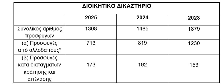 Το 2025, οι καταχωρισθείσες εφέσεις εναντίον αποφάσεων του Διοικητικού Δικαστηρίου Διεθνούς Προστασίας αυξήθηκαν κατά 8% σε σύγκριση με το 2024 και μειώθηκαν κατά 20% σε σύγκριση με το 2023.