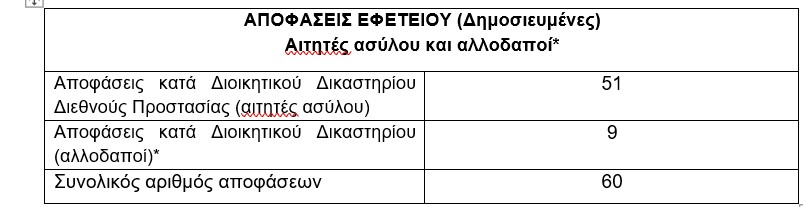 - Το 2025 εκδόθηκαν 60 αποφάσεις (δημοσιευμένες) που αφορούν αιτητές ασύλου και αλλοδαπούς*. Οι 51 εκδόθηκαν σε σχέση με αποφάσεις του Διοικητικού Δικαστηρίου Διεθνούς Προστασίας και οι 9 σε σχέση με αποφάσεις του Διοικητικού Δικαστηρίου.
