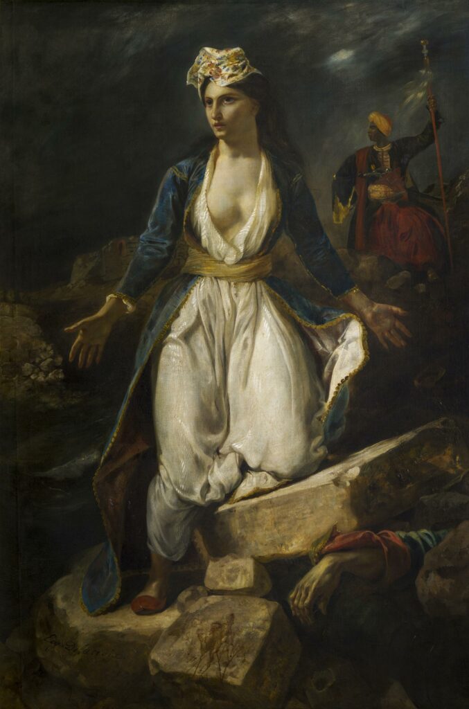 Στην έκθεση της γκαλερί Lebrun «προς ενίσχυση των Ελλήνων» (1826) παρουσιάστηκε και «Η Ελλάδα στα ερείπια του Μεσολογγίου», του Ευγένιου Ντελακρουά. Υπενθυμίζεται πως ο εμβληματικός πίνακας, οποίος ανήκει στο Μουσείο Καλών Τεχνών στο Μπορντώ, ταξίδεψε στην Ελλάδα και εκτίθεται (έως τέλος Νοεμβρίου), στο Ξενοκράτειο Αρχαιολογικό Μουσείο (Μεσολόγγι). Η Ελλάδα προβάλλεται ως πενθούσα κόρη, με ενδυμασία ανοικτή στο στήθος. Πατά πάνω σε συντρίμμια, τα οποία έχουν καταπλακώσει έναν αγωνιστή ενώ με μάτια και χέρια καλεί σε θέαση και συμπάθεια.