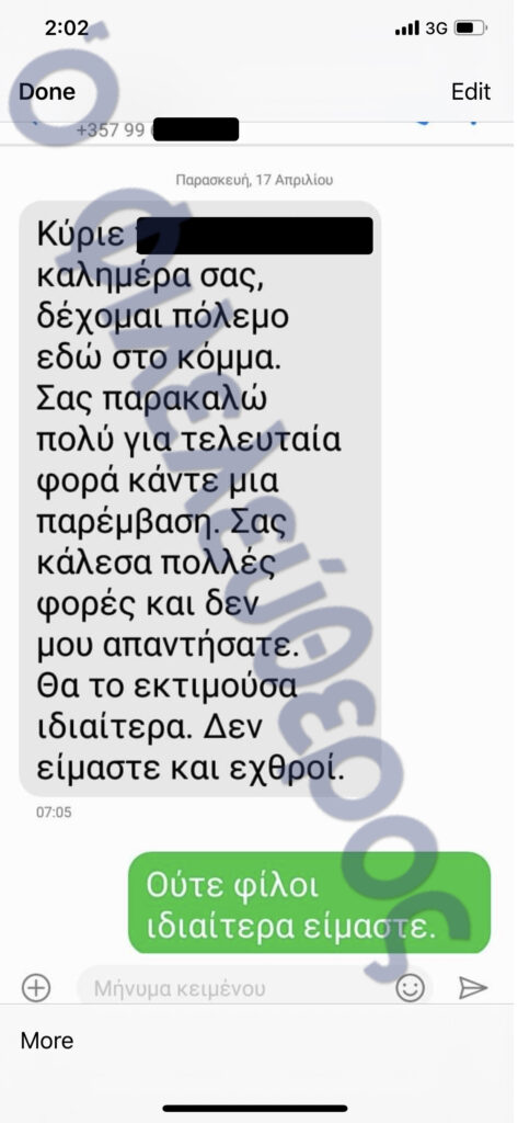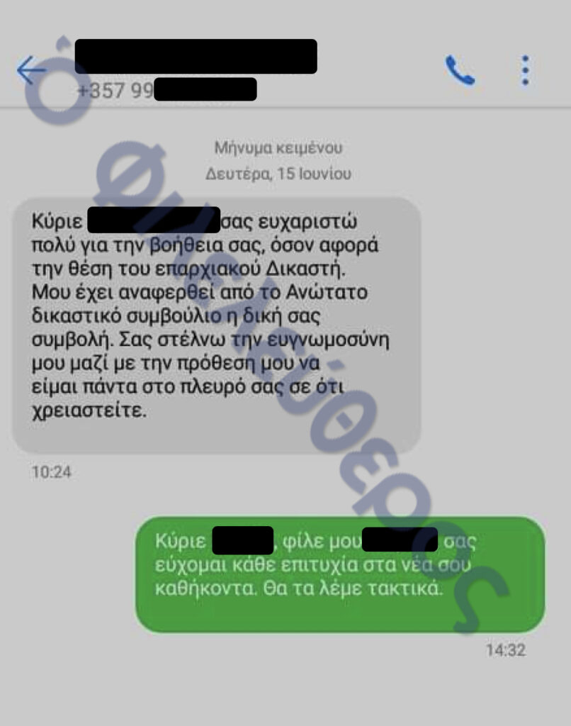 >> Κομματικό στέλεχος (σ.σ. σύμφωνα με τον κυπριακό τηλεφωνικό αριθμό που εμφανίζεται) παρουσιάζεται να αποτείνεται σε Δικαστή και να του ζητά βοήθεια. Το μέλος κόμματος τον ενημερώνει ότι δέχεται «πόλεμο εδώ στο κόμμα». Στη συνέχεια κάνει έκκληση: «Σας παρακαλώ για μια τελευταία φορά κάντε μια παρέμβαση. Σας κάλεσα πολλές φορές και δεν μου απαντήσατε. Θα το εκτιμούσα ιδιαίτερα. Δεν είμαστε και εχθροί». Ο αποδέκτης του μηνύματος απαντά: «Ούτε φίλοι ιδιαίτερα είμαστε».