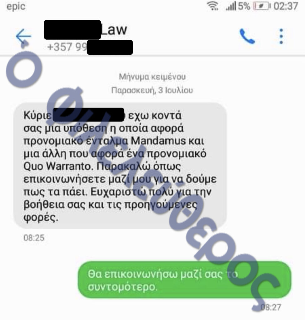 >> Εμφανίζεται κατάσταση επαφών και μηνύματα που αντάλλασσε ανώτερος Δικαστικός. Το αρχείο η αυθεντικότητα του οποίου θα ελεγχθεί όταν κατατεθεί στην Αστυνομία, εμφανίζει τον τελευταίο να είναι σε επικοινωνία με αξιωματούχο της Νομικής Υπηρεσίας, έναν Κύπριο νομικό, παράγοντα με προσβάσεις σε πολύ γνωστό Κύπριο δικηγόρο, με ανώτατο στέλεχος της εκτελεστικής εξουσίας στην Κύπρο, γνωστό πολιτικό πρόσωπο, νυν ευρωβουλευτή και μέλος της εκτελεστικής εξουσίας στην Ελλάδα.