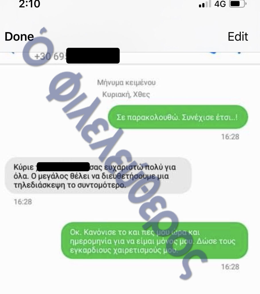 >> Νομικός φέρεται να ζητά από τη «Σάντη» μηνύματα που αφορούν αξιωματούχους. Η «Σάντη» δεσμεύεται ότι θα του τα στείλει.