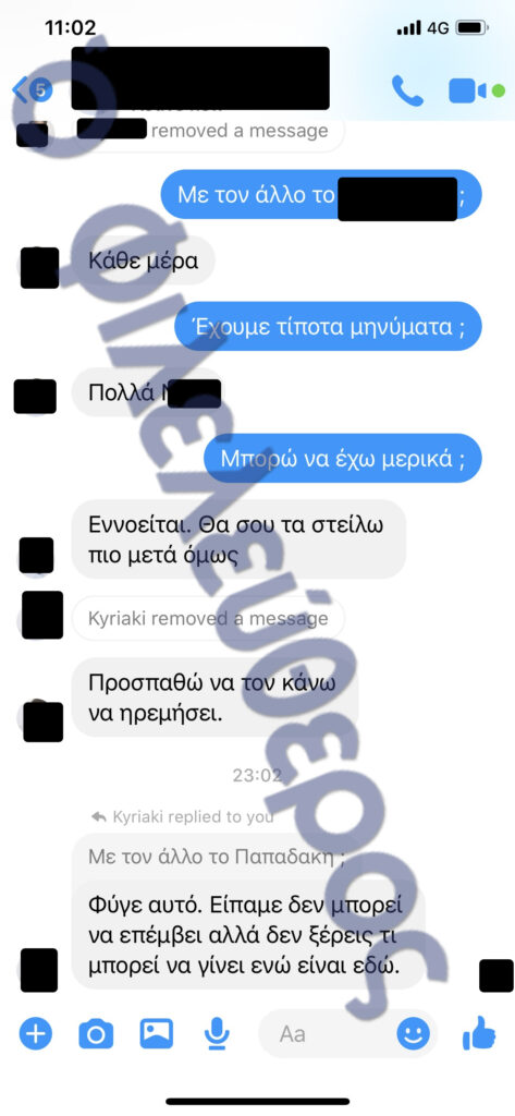 Σύμφωνα με την εικόνα που αποτυπώνουν τα στιγμιότυπα οθόνης κινητού, η «Σάντη» λάμβανε και μοιραζόταν πληροφορίες με τρίτα άτομα για το πρόσωπο με το οποίο διατηρούσε τον δεσμό, ενώ επικοινωνούσε κι απευθείας μαζί του.