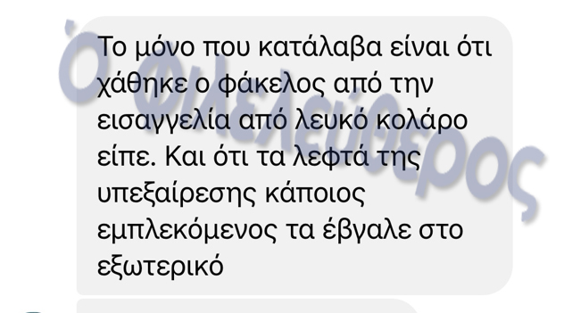 >> Η «Σάντη» αναφέρεται σε μια υπόθεση (σ.σ. δεν υπάρχει χρονολογία και ημερομηνία) σημειώνοντας τα ακόλουθα: «Το μόνο που κατάλαβα είναι ότι χάθηκε ο φάκελος από την εισαγγελία από λευκό κολλάρο είπε. Και ότι τα λεφτά της υπεξαίρεσης κάποιος εμπλεκόμενος τα έβγαλε στο εξωτερικό».