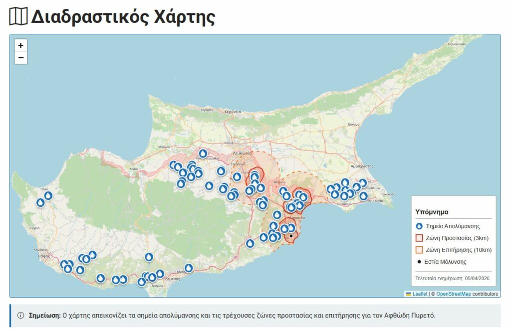 Μέσω της ιστοσελίδας, το κοινό μπορεί να έχει πρόσβαση στον διαδραστικό χάρτη (https://fmd.moa.gov.cy/maps/) και να ενημερώνεται για τις εστίες κρουσμάτων, καθώς και για τις ζώνες προστασίας και περιορισμού που καθορίζονται γύρω από αυτές, αναφέρει η ανακοίνωση.