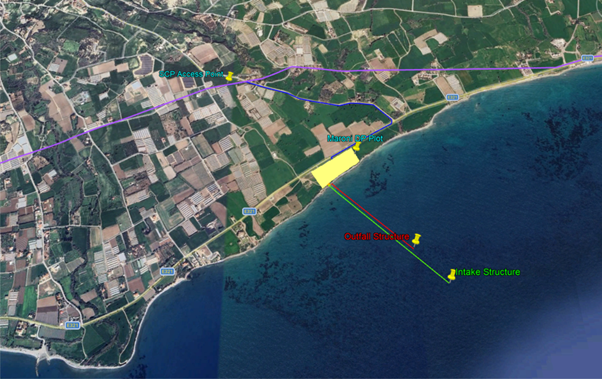 Θαλάσσιο υπόβαθρο: Ο πυθμένας στο σημείο απόρριψης αποτελείται από άμμο και ιλύ, με φτωχή πανίδα, γεγονός που σημαίνει ότι η άλμη θα έχει τις λιγότερες δυνατές επιπτώσεις.