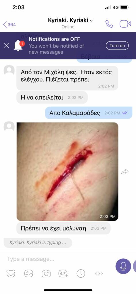 Στο μήνυμα επισυνάπτεται φωτογραφία με πληγή στο χέρι της.