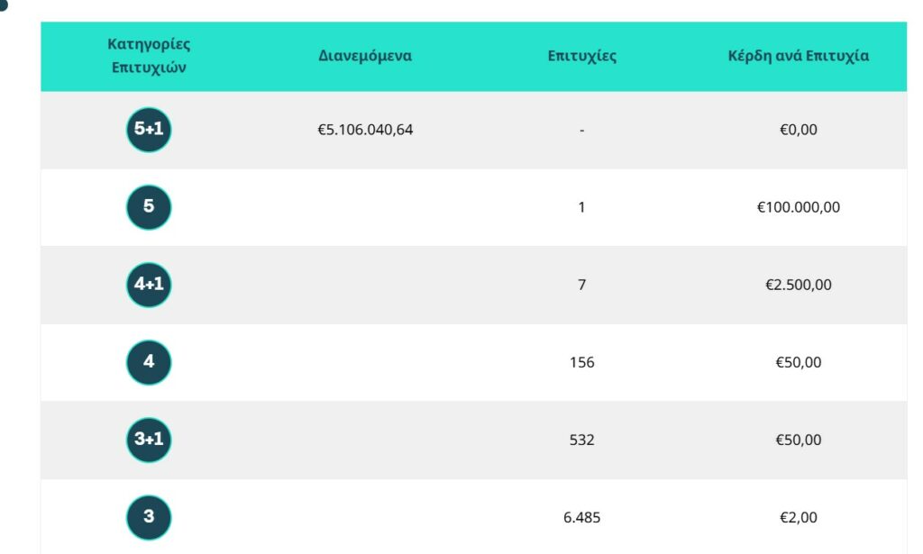 Επίσης, ένα (1) τυχερό δελτίο βρέθηκε στη 2η κατηγορία (5), το οποίο κερδίζει το ποσό των €100.000,00.