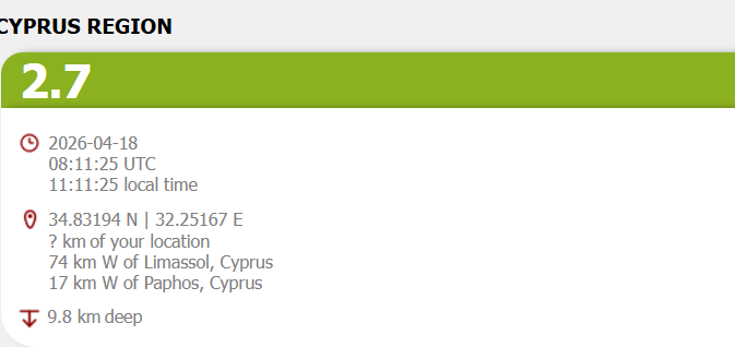 Το επίκεντρο εντοπίζεται περίπου 17 χιλιόμετρα δυτικά της Πάφου και 74 χιλιόμετρα δυτικά της Λεμεσού.