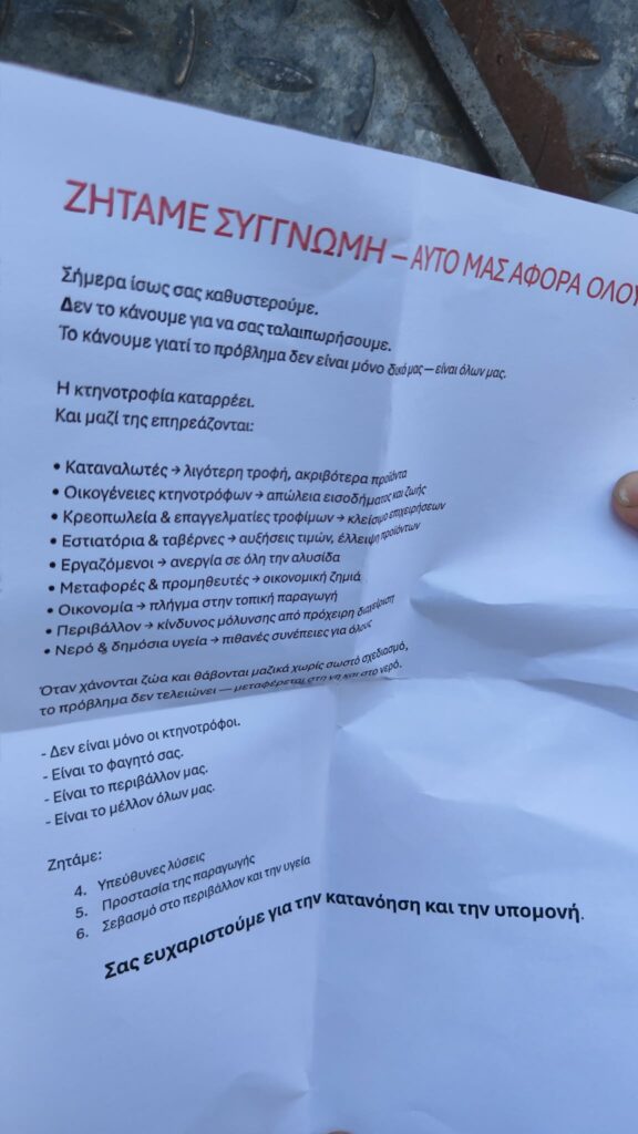 Σημειώνεται ότι οι κτηνοτρόφοι δίνουν ενημερωτικό υλικό στους διερχόμενους οδηγούς. Αξίζει να σημειωθεί ότι στο στον χώρο έσπευσε και καντίνα για σάντουιτς, ο οδηγός της οποίας απομακρύνθηκε με οδηγίες της αστυνομίας.
