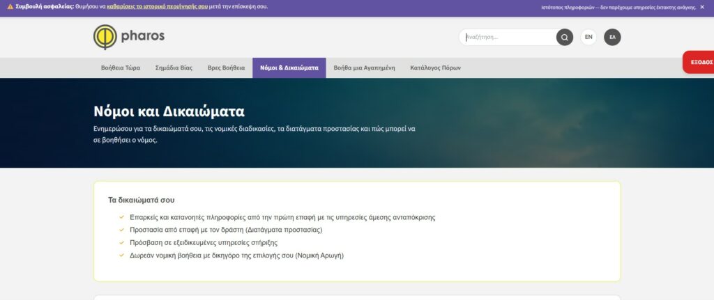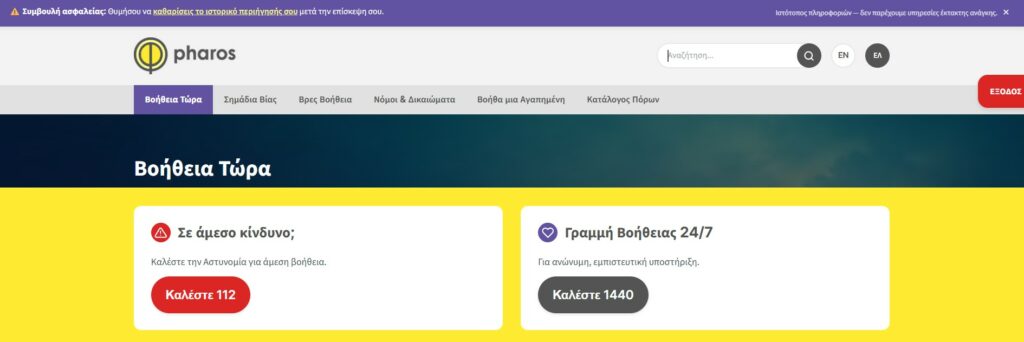 Σε όλη τη διάρκεια περιήγησης στην πλατφόρμα, υπάρχει διαθέσιμο κουμπί έκτακτης εξόδου, ώστε να μην γίνει αντιληπτή η χρήση του ΦΑΡΟΥ από τον κακοποιητή. Παράλληλα, προσφέρονται οδηγίες για τον καθαρισμό του ιστορικού από την επίσκεψη.