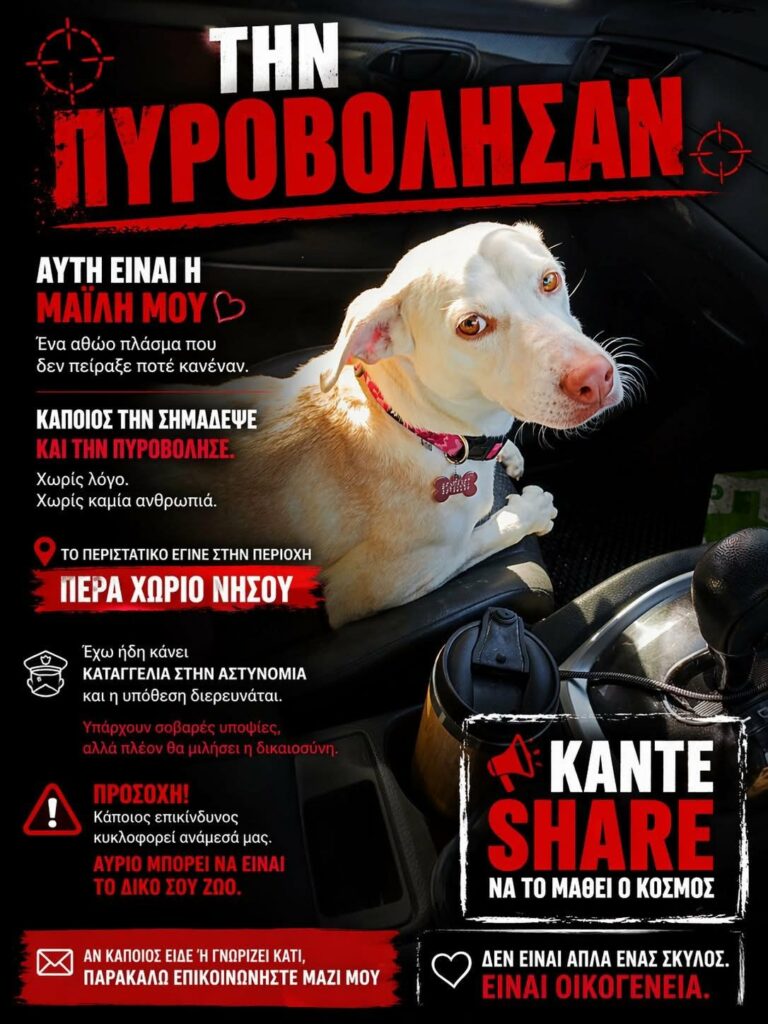 Σύμφωνα με ανακοίνωση του Κινήματος, το περιστατικό σημειώθηκε την Τετάρτη, 22 Απριλίου 2026. Το σκυλάκι, η Μαΐλη, εντοπίστηκε τραυματισμένο και μεταφέρθηκε άμεσα σε κτηνίατρο, όπου λαμβάνει την απαραίτητη ιατρική φροντίδα.