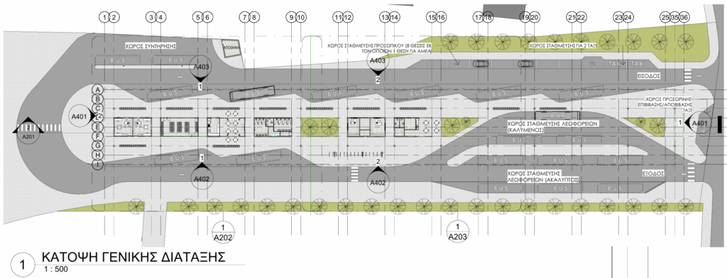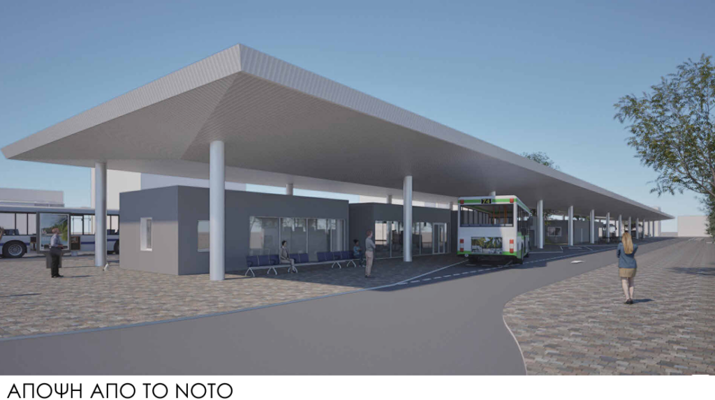 β) Τμήμα Β: κτιριακές εγκαταστάσεις στις οποίες περιλαμβάνονται εκδοτήρια εισιτηρίων, γραφειακοί χώροι, αίθουσα αναμονής, κυλικείο, χώροι υγιεινής κοινού και προσωπικού και χώρος ανάπαυσης προσωπικού. Τα κτίρια θα καλύπτονται από μεταλλικό στέγαστρο εμβαδού 3100μ2. Το τεμάχιο ανάπτυξης είναι συνολικού εμβαδού 9750μ2 περίπου. Επιπρόσθετα, το έργο θα περιλαμβάνει 8 στάσεις λεωφορείων, 9 χώρους στάθμευσης λεωφορείων (καλυμμένους και μη), 7 χώρους στάθμευσης για προσωπικό, 2 χώρους στάθμευσης για ταξί και 1 χώρο στάθμευσης για ΑμεΑ, χώρο συντήρησης με 2 χώρους στάθμευσης λεωφορείων, αποθήκη και χώρο προσωρινής επιβίβασης/αποβίβασης για ταξί.