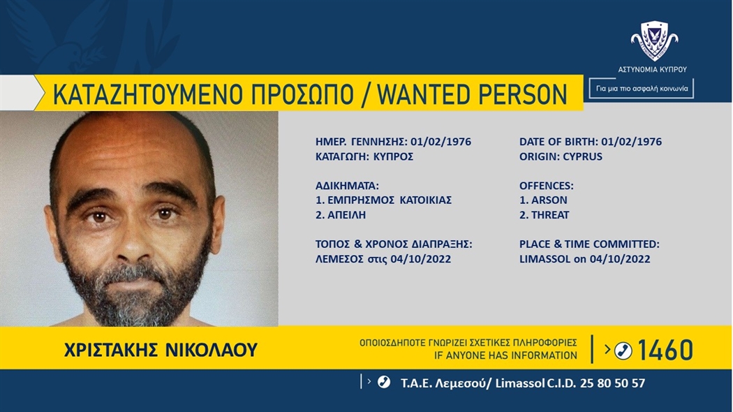 Πρόκειται για τον Χριστάκη Νικολάου, ημερομηνία γέννησης 01/02/1976, από Λεμεσό, εναντίον του οποίου έχει εκδοθεί δικαστικό ένταλμα σύλληψης, για σκοπούς διερεύνησης της υπόθεσης.