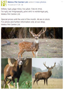 Συγκεκριμένα, το Melios Zoo Park, σε ανάρτησή του στο Facebook, ανακοίνωσε ότι πουλά ελάφια και αγρινά σε «ειδικές τιμές. Όλα σε στοκ», προκαλώντας τις έντονες αντιδράσεις του κόσμου.
