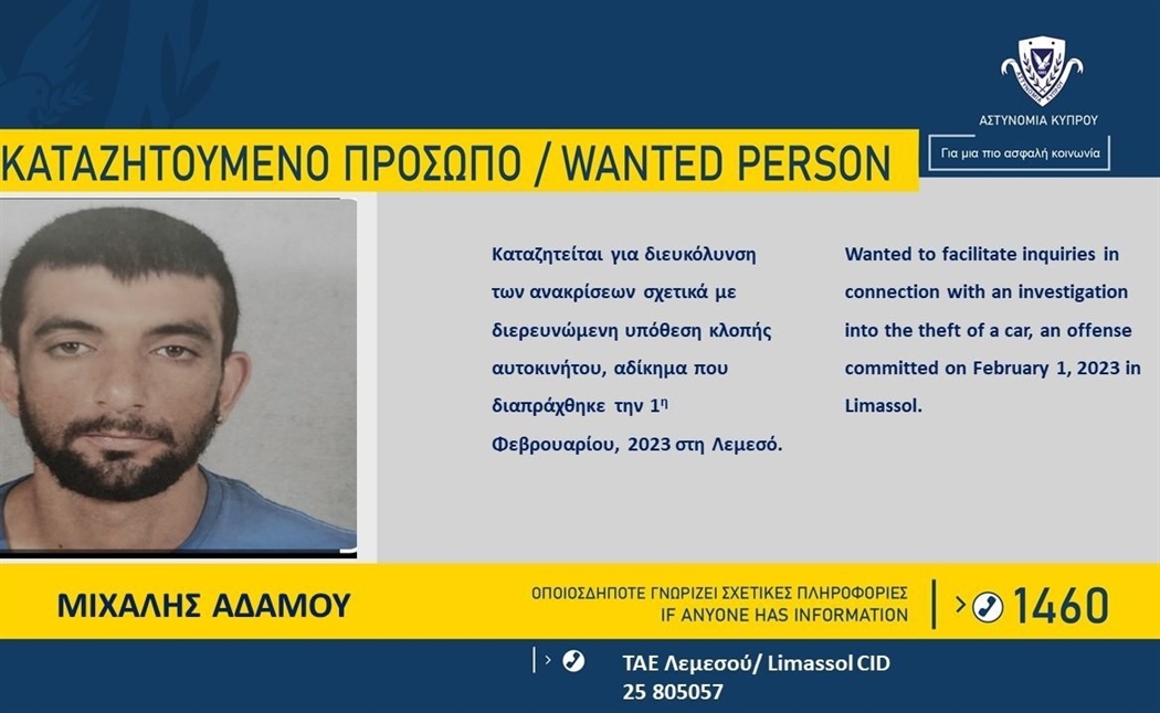 Καταζητείται από την Αστυνομία για υπόθεση κλοπής αυτοκινήτου, αδίκημα που διαπράχθηκε την 1η Φεβρουαρίου, 2023 στη Λεμεσό.